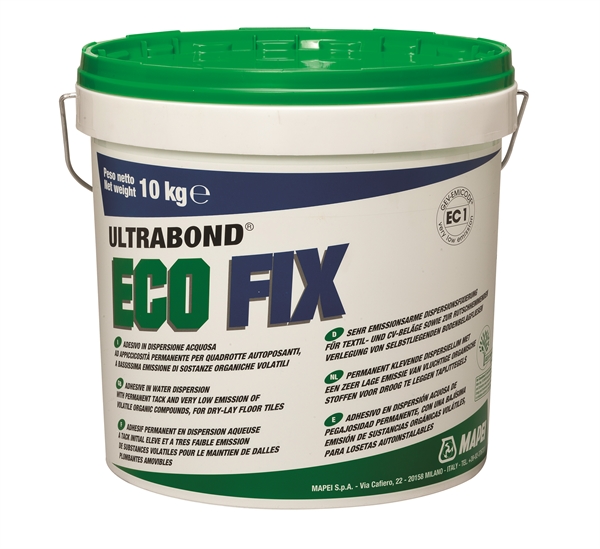 Adeziv transparent in dispersie apoasa, Ultrabond Eco Fix de la Mapei, ce se utilizeaza la fixarea antialunecare (lipire ce permite dezlipirea ulterioara) a dalelor de mocheta cu orice tip suport, a mochetei tip venetian sau dalelor de PVC cu suport PVC peste toate tipurile de suprafete suport, inclusiv de lemn, PVC, cauciuc, linoleum, beton, ceramica, marmura sau peste pardoseli tehnice inalte.