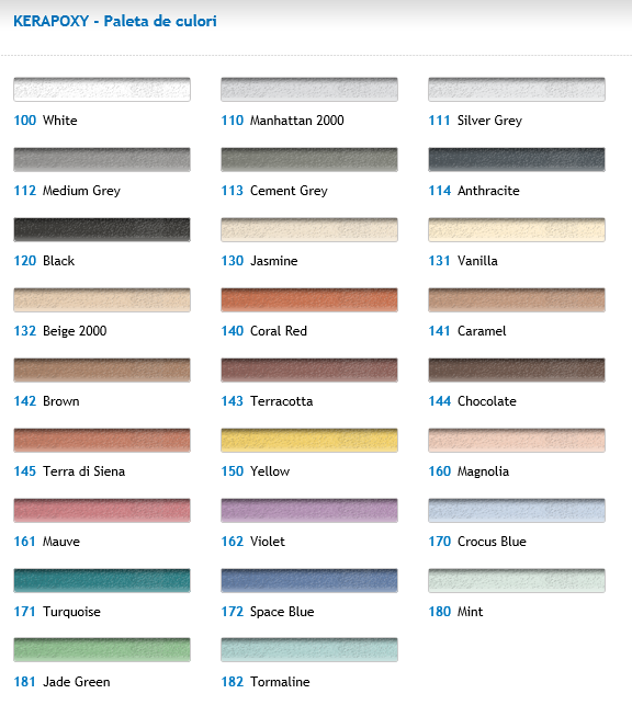 Chit pentru rosturi Kerapoxy disponibil intr-o gama larga de culori: alb-bianco, negru, antracit, manhattan, gri, ciment, argintiu, maro, bej, caramel, teracota, ciocolatiu, sienna, vanillia, jasmine, galben, mov, violet, crocus, turcoaz, albastru.