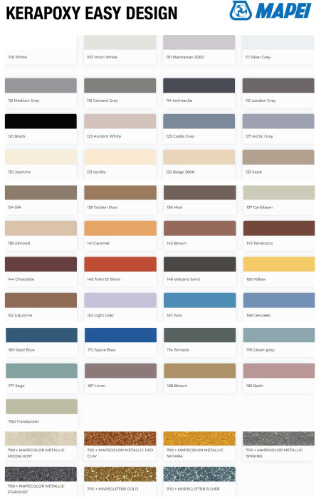 Chitul pentru rosturi Kerapoxy Design, indeosebi varianta de culoare neutra, se poate amesteca cu MAPEGLITTER - fulgi colorati (argintii sau aurii), metalizati din poliester, aluminiu si rasina epoxidica. Consum: o punga de 100 grame fulgi la 1 kg de Kerapoxy Design.