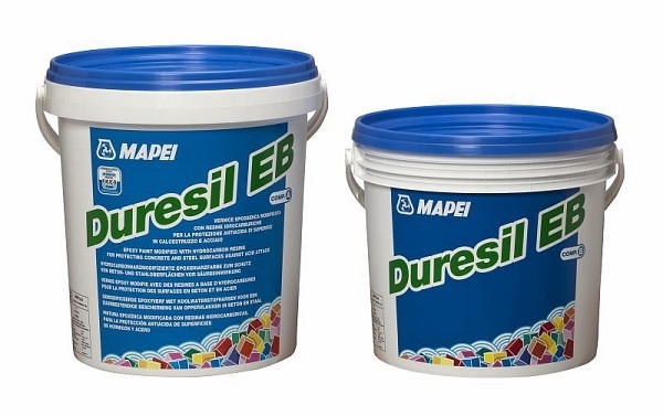 Vopsea epoxidica bicomponenta Duresil EB de la Mapei pentru protejarea antiacida a suprafetelor din otel si beton. Kit bicomponent de 10kg (5+5).
